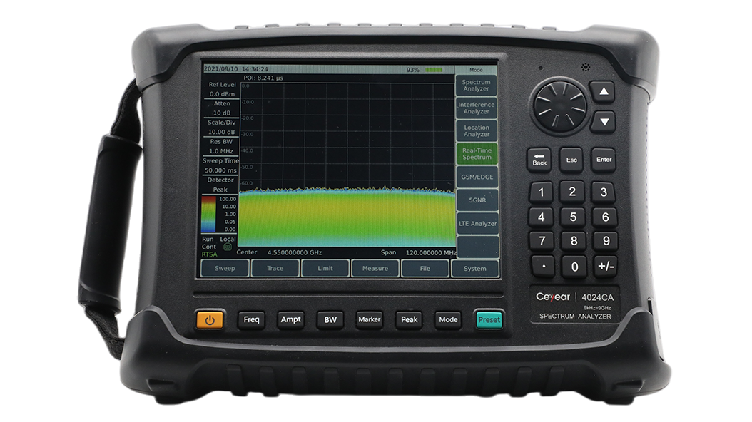 The 4024CA spectrum analyzer is a broadband handheld real-time spectrum analyzer designed for field testing. The maximum real-time analysis bandwidth reaches 120MHz. It has real-time spectrum analysis, 5G NR demodulation analysis, LTE FDD/TDD demodulation analysis, GSM/ EDGE demodulation analysis, directional analysis and other measurement function modes, as well as field strength measurement, channel power, occupied bandwidth, adjacent channel power, audio demodulation, harmonic distortion, spectral emission mask/spurious emission mask, indoor/outdoor map measurement It adopts 8.4-inch large-screen LCD and capacitive touch screen integrated design to facilitate user operation. The structure adopts a handheld chassis, which is small in size, light in weight, flexible in power supply, easy to maneuver, and is extremely suitable for on-site use.