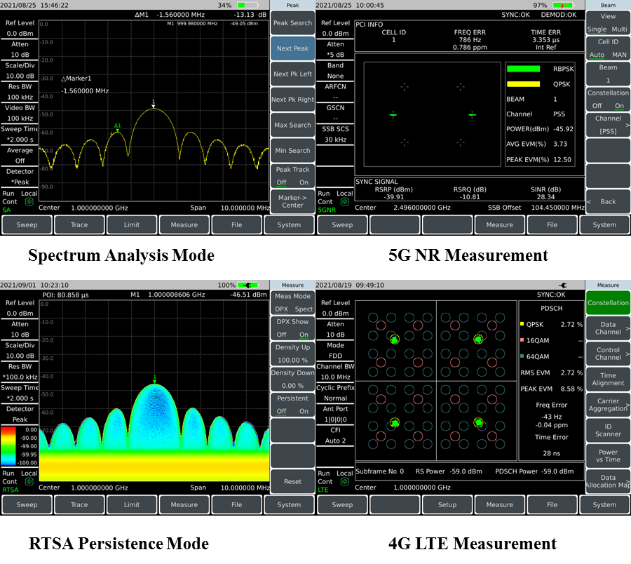 •Various measurement functions: spectrum analyzer, interference analyzer (spectrogram, RSSI), RTSA, 5G NR demodulation, LTE FDD/TDD demodulation, GSM/EDGE demodulation function etc.