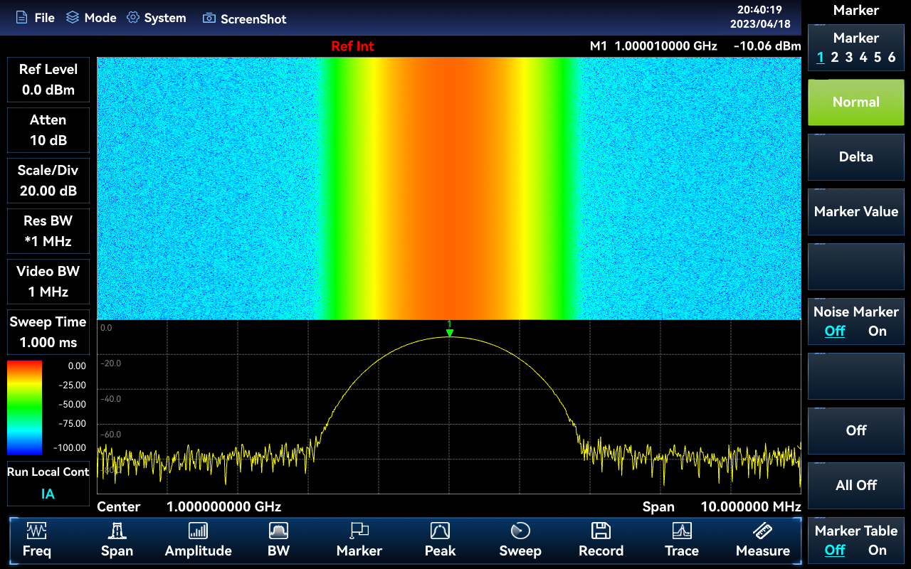 The interference analyzer option has spectrum , spectrogram and RSSI measurement. Spectrogram uses the frequency-amplitude-time three-dimensional display mode, which can conveniently observe periodic or intermittent signals. The different colors displayed in the waterfall plot reflect the strength of signal amplitude. RSSI (received signal strength indicator) is mainly used to measure the intensity change of a point frequency signal in a period of time. Both Spectrogram and RSSI measurement support the automatic storage of signals.