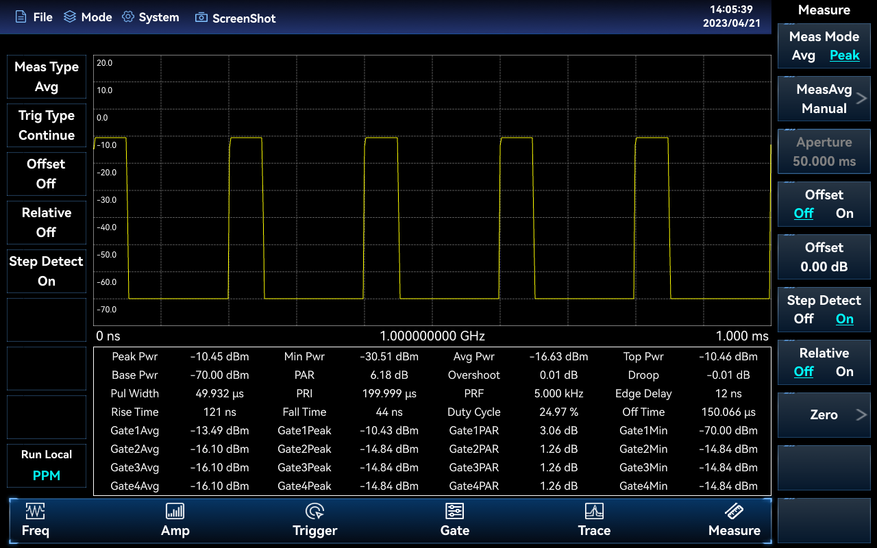 By connecting to the Ceyear 87234D/E/F/L USB peak sensor via the USB interface, this function can be used to test RF/microwave signals up to 67GHz, enabling pulse power measurement in a large dynamic range.