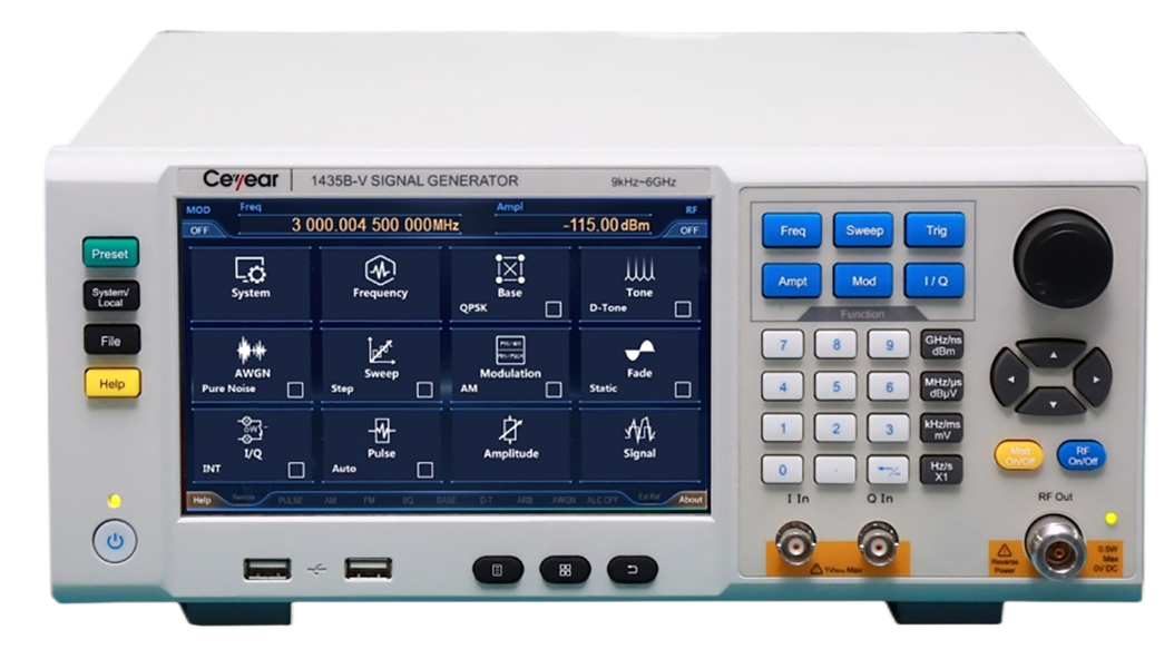 Based on innovative technologies, the 1435 series signal generator achieves balance in terms of performance, economy and volumetric weight. It also has excellent spectral purity, with a single side band (SSB) phase noise of -136dBc/Hz (when the carrier is 1GHz and the frequency offset is 10kHz) or -116dBc/Hz (when the carrier is 10GHz and the frequency offset is 10kHz). It provides a high power output and a large dynamic range, with the maximum output power up to 20dBm@20GHz and an output power dynamic range greater than 150dB. It responds fast and switches to another frequency in only 1ms, which shortens the test time and improves test efficiency, meeting the needs of massive data testing; in addition, it also has excellent analog modulation and pulse modulation functions. By adopting advanced frequency synthesis and RF channel signal processing technologies, it can achieve high performance while reducing the cost. Besides, it is equipped with a 7-inch high-sensitivity LED touch screen, and supports operation by touch screen, panel buttons, rotary knobs, external mouse and keyboard, etc., which fully upgrades the users’ operation experience. It adopts portable 3U chassis structure and is featured by small size and light weight, and thus is easy to carry. The 1435 series signal generator can meet both the test requirements for high performance in the R&D phase and the test requirements for high efficiency in the production phase.