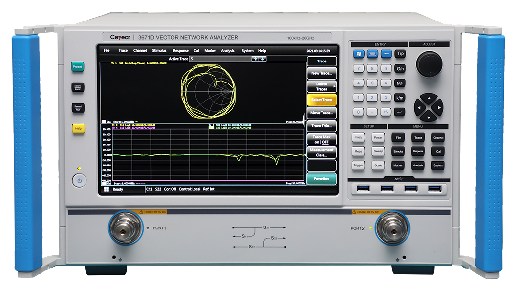 3671 series vector network analyzer include 3671C (100 kHz~14GHz), 3671D (100 kHz~20GHz), 3671E (100 kHz~26.5GHz), 3671G (10MHz~43.5GHz). 3671series network analyzer provides frequency response, Single-port, response isolation, enhanced response, full-dual port, electronic calibration etc. Offer various display formats, such as logarithmic amplitude, linear amplitude, phase, group delay, Smith chart and polar coordinates. It designed with several standard interfaces, such as: USB, LAN, GPIB, VGA, and HDMI interface. It can accurately measure the amplitude frequency characteristics and phase frequency characteristics and group delay characteristics of microwave network. 3671 series vector network analyzers retain the features of high-end vector network analyzers, including performance indicators, instrument appearance, display effect, software interface, etc., while controlling the volume, weight, wind noise and other aspects of the instrument to create a good experience for users. The product can be widely used in communication and other fields, which are indispensable test equipment in university scientific research.