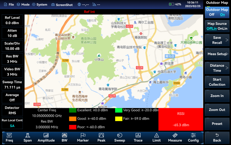 Channel Power, Occupied Bandwidth, Adjacent Channel Power, Spectrum Emission Mask, Carrier-to-Noise Ratio, Harmonic Distortion, Spurious Emission Mask, Indoor/Outdoor Map, Gated Sweep, etc. Support GPS/Beidou positioning and frequency disciplined function for the crystal in the instrument, the typical frequency reference accuracy after GPS locking calibration can reach ±10ppb.