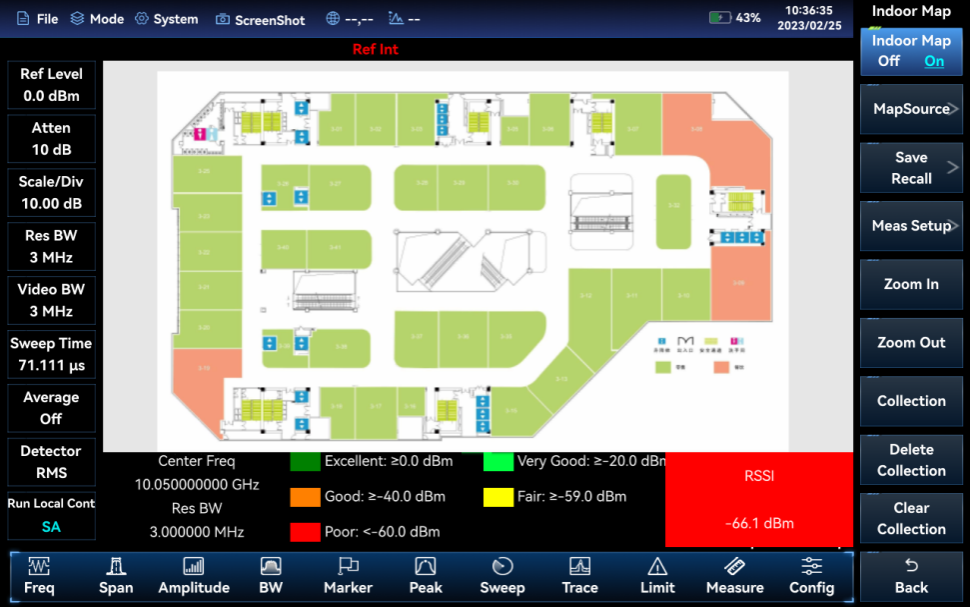 | 4025-S06 | Outdoor Map Option | RSSI and Adjacent Channel Power Ratio tests can be carried out under the indoor map, with the results marked on the map by dotting the correlation between signal strength and color. | |