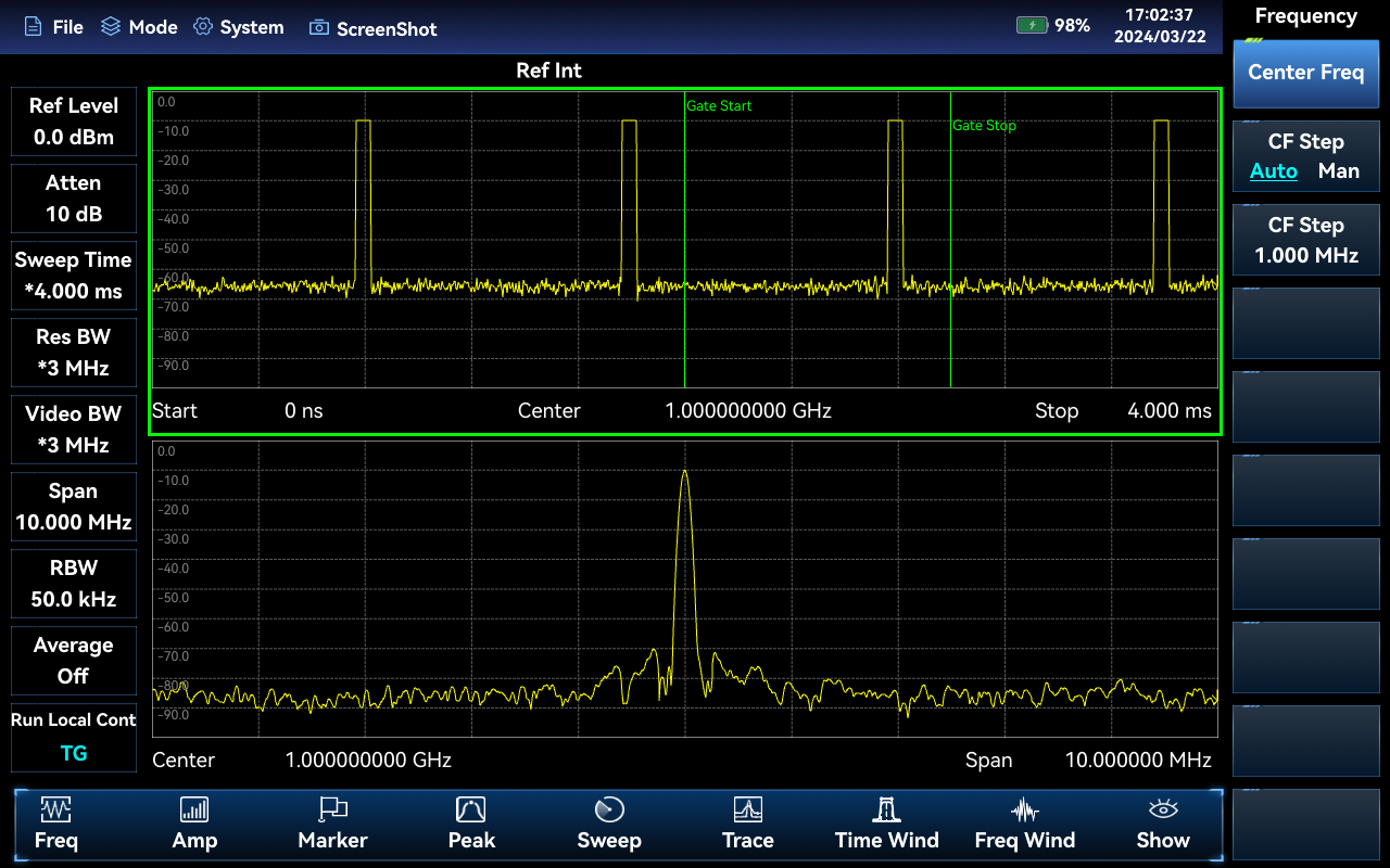 The Time Gate scanning function is used for interference detection of time-division signals, and the time gate scanning function is divided into the time domain window and the frequency domain window. In the time domain window, you can select the signals in a specific time period by setting the [Delay] and [Length], and the frequency domain results of the selected signals will be displayed in the frequency domain window. By setting [Delay] and [Length], the uplink signal can be selected out, so as to achieve the effect of "filtering" the downlink signal (the downlink signal will have an effect on the search of interfering signals).