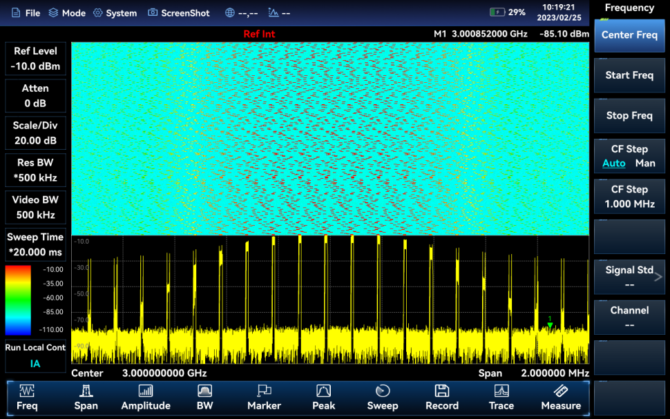 The Interference Analyzer option features spectrum measurement, Spectrogram and RSSI measurement. The Spectrogram uses a three-dimensional display of frequency-amplitude-time, making it easy to observe periodic or intermittent signals. The different colors in the Spectrogram show the strength of the signal amplitude, RSSI is mainly used to measure the power change of a point frequency signal in a time period, both Spectrogram and RSSI measurement support the automatic storage function of the signal.