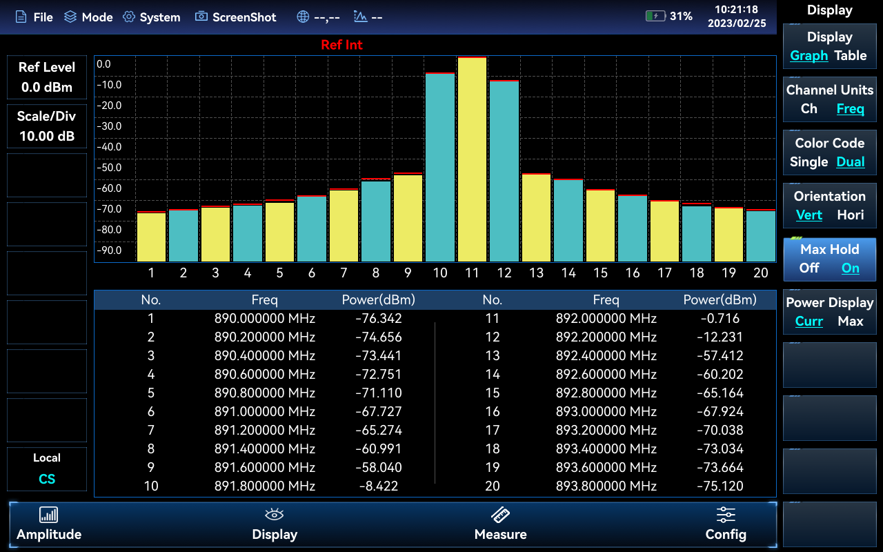 10.1" LCD and capacitive touch screen with 6 independent markers, support for marker dragging, frequency/amplitude parameters dragging and scaling functions, support for signal tracking and peak tracking, 3 display traces, 6 detection methods (Normal, Peak, Negative Peak, Sample, Average, RMS).