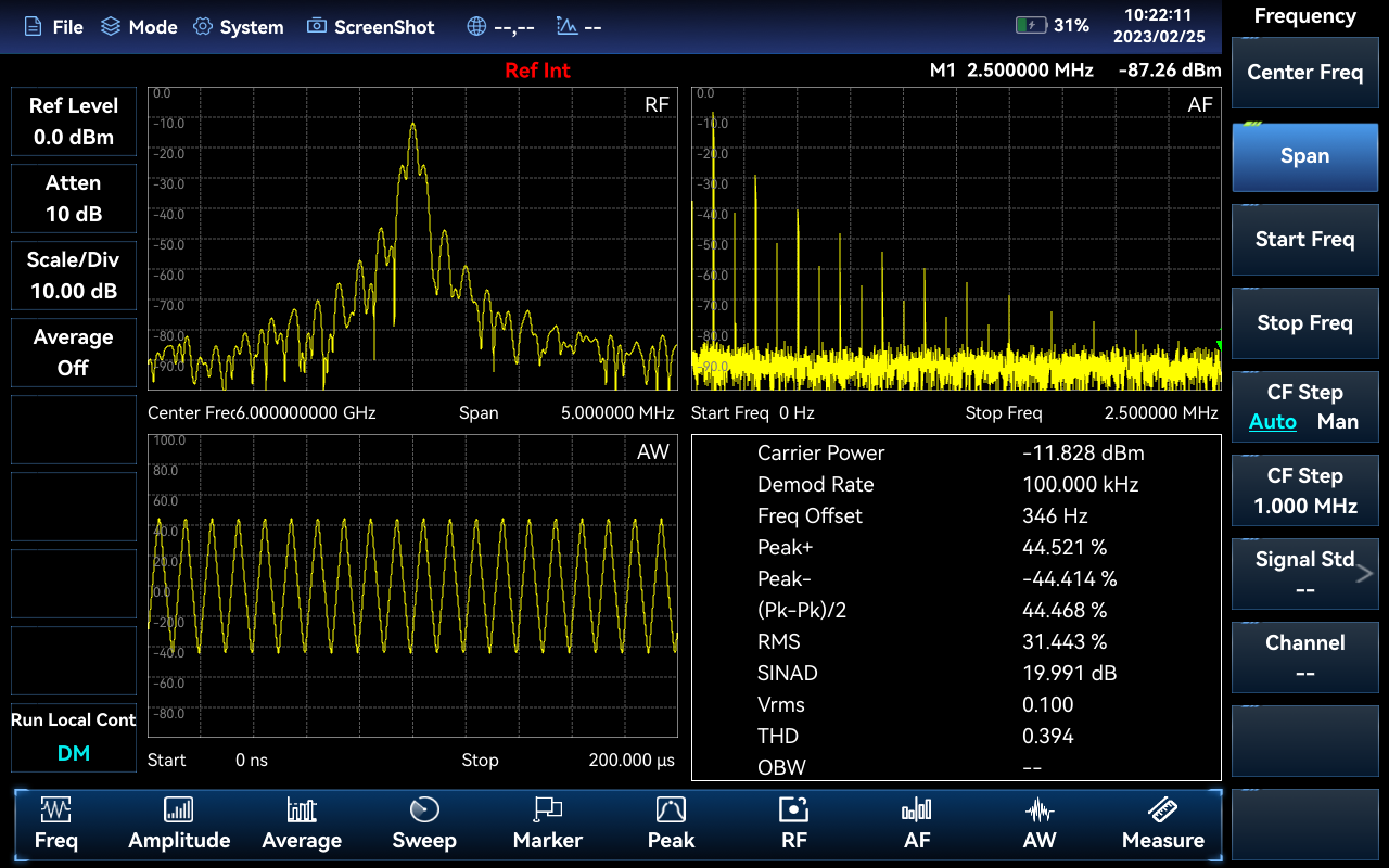 Parameter analysis function: Carrier power, Demodulation rate, carrier frequency offset, modulation depth (AM), modulation frequency offset (FM), SINAD, modulation distortion, total harmonic distortion and other parameters of the modulated signal can be measured and analyzed.