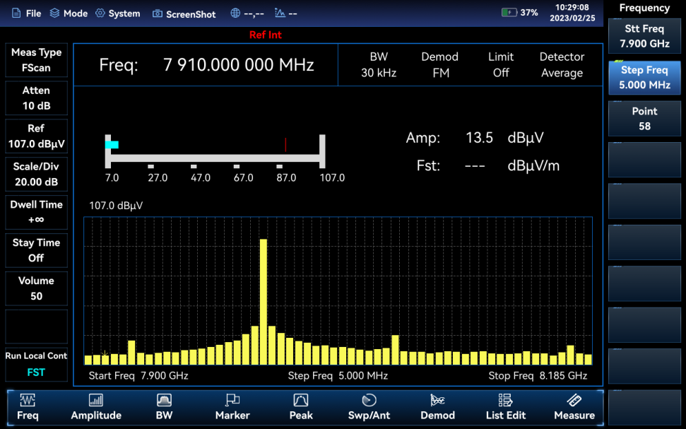 The 4025 spectrum analyzer can be used with portable antennas for field strength measurements and is widely used in space electromagnetic environment monitoring and radio management. The antenna file can be called up directly by the user or the antenna factor can be defined. Field Strength measurements can be made in three modes: point frequency measurements, frequency scan measurements and list scan measurements. Point frequency measurement is performed by setting the point frequency to observe the frequency offset, amplitude and field strength of the current signal; frequency scan measurement is performed by setting the start frequency, step frequency and number of scanning points to observe the amplitude and field strength of a frequency range; list scan measurement is performed by calling a pre-edited or saved list to observe the amplitude and field strength of the listed frequency points.