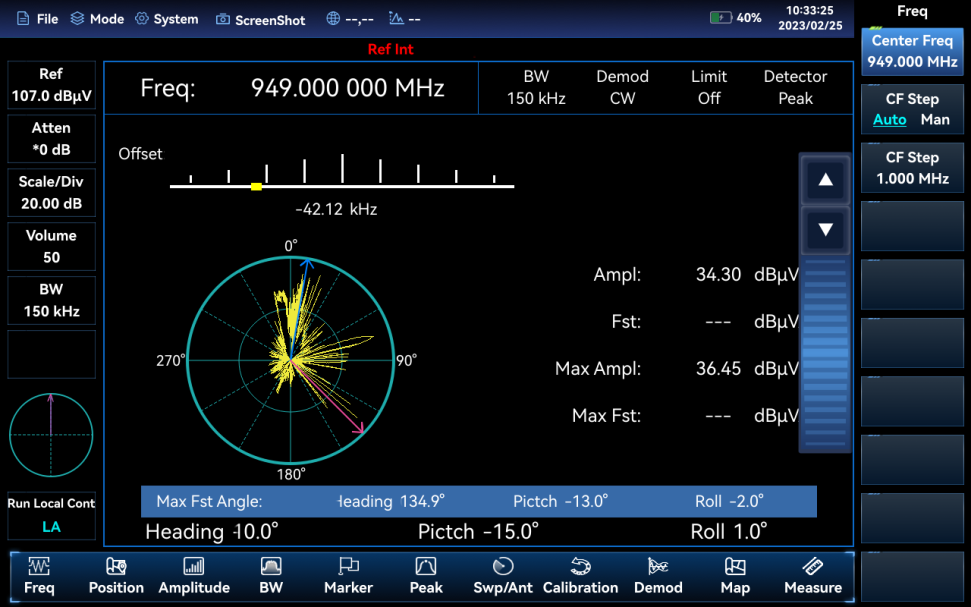 The Location Analyzer option requires a directional antenna, USB electronic compass and GPS/Beidou options to achieve direct interference signal finding, horizontal scan direction finding and map cross-location. When equipped with the ZE9080 series antenna and handheld handle, a separate configuration is not necessary due to its built-in electronic compass.