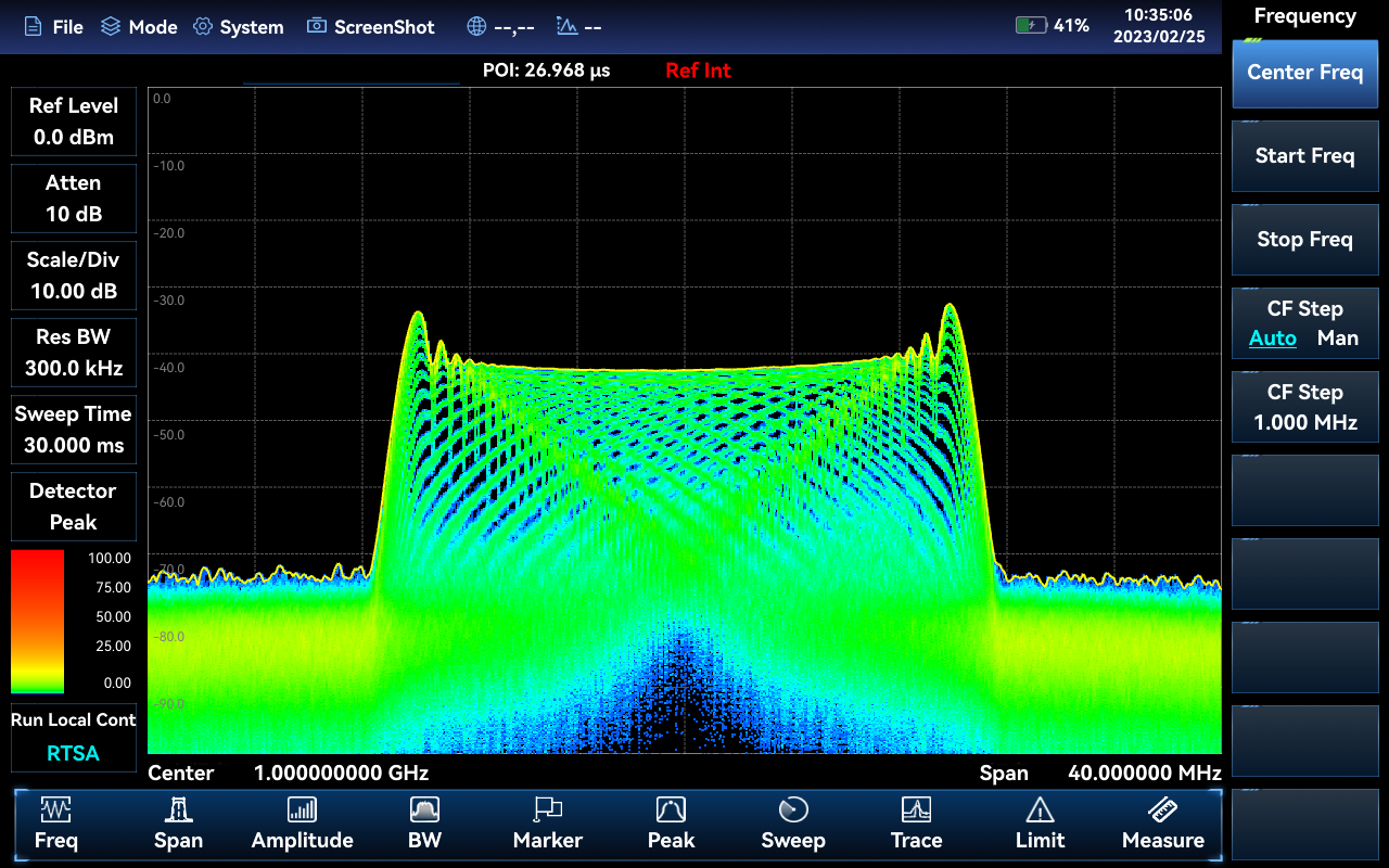 The 4025 spectrum analyzer has a Real-time Spectrum analyzer function, which is mainly used for the capture and analysis of transient time-varying signals and burst signals. The real-time analysis bandwidth is up to 40MHz or 120MHz, and the transient signal DPX and Spectrogram measurement functions can be realized.